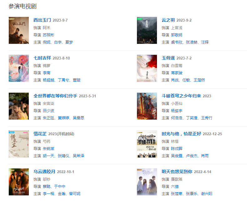 代表作品:云之羽、全世界都在等你們分手、玉骨遙、時光與他,恰是正好、惜花芷、西出玉門