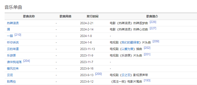 2024年1月1日,參加《揚(yáng)帆遠(yuǎn)航大灣區(qū)——2024新年音樂(lè)會(huì)》,與炎明熹一起演唱歌曲《刀劍如夢(mèng)》《江湖笑》; 1月6日,演唱電視劇《我們的翻譯官》片頭曲《聽(tīng)你訴說(shuō)》;1月8日,發(fā)布單曲《一眼》; 1月,參加《2023微博之夜》,并和伯遠(yuǎn),劉宇,米卡,許佳琪一起表演《第一天》; 1月25日,參加《2024山東春節(jié)聯(lián)歡晚會(huì)》;1月27日,參加《航天之夜》;2月2日,參與演出的《中央廣播電視總臺(tái)2024網(wǎng)絡(luò)春晚》在愛(ài)奇藝播出,演唱歌曲《365個(gè)祝?!?;2月3日,參與演出的《同心向未來(lái)——2024中國(guó)網(wǎng)絡(luò)視聽(tīng)年度盛典》播出,并表演節(jié)目《沙與?!?。2月4日,參加2024年央視特別節(jié)目《新春非遺之夜》,與黃齡演唱歌曲《國(guó)色》。2月5日,參加央視節(jié)目《“經(jīng)典之夜”年度盛典》,演唱歌曲《絨花》 ;2月7日,參加《2024山東春節(jié)聯(lián)歡晚會(huì)》,表演歌曲《父親寫(xiě)的散文詩(shī)》《龍的傳人》;2月9日,參加《龍騰虎躍·中國(guó)年味》,演唱歌曲《人間好時(shí)節(jié)》 ;同日,參加《2024年中央廣播電視總臺(tái)春節(jié)聯(lián)歡晚會(huì)》,合作表演節(jié)目《流行勁曲串燒》;2月10日,參加《2024年江蘇衛(wèi)視春節(jié)聯(lián)歡晚會(huì)》;同日,參加《百花迎春——中國(guó)文學(xué)藝術(shù)界2024春節(jié)大聯(lián)歡》,表演節(jié)目《驍》 ;2月24日,加盟《2024江蘇衛(wèi)視元宵晚會(huì)》,演唱歌曲《別為難星星》。