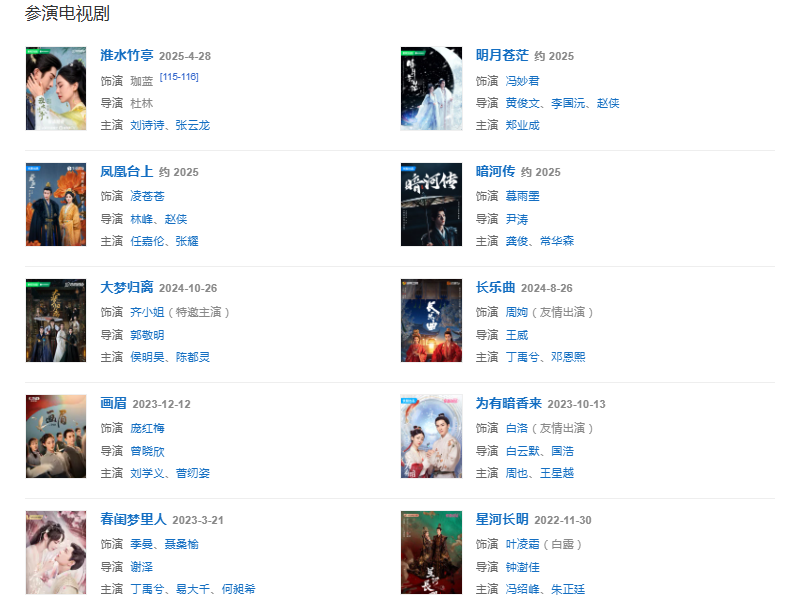 2025年3月,參加芒果TV綜藝《乘風(fēng)2025》;4月28日,出演的東方俠情群像劇《淮水竹亭》播出。