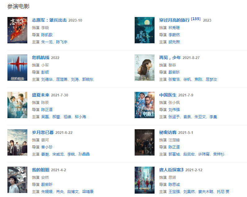 職 業(yè):演員代表作品唐山大地震、唐人街探案、快把我哥帶走、我的姐姐、你好,之華、盛夏未來、小別離