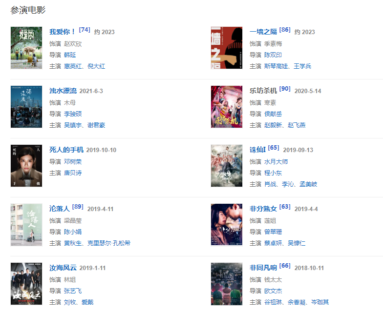 2019年4月3日,特別出演的古裝神話劇《新白娘子傳奇》在愛奇藝播出,在劇中飾演許仙的母親。4月4日,出演電影《非分熟女》。