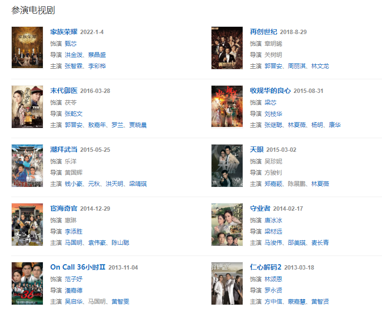 代表作品:智勇新警界、宮心計、溏心風(fēng)暴之家好月圓、On Call 36小時、名媛望族