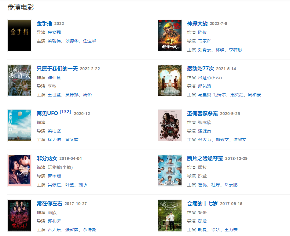 2021年,將參演莊文強(qiáng)新作《金手指》。5月14日,主演愛情電影《感動她77次》,飾演職場女孩Eva。