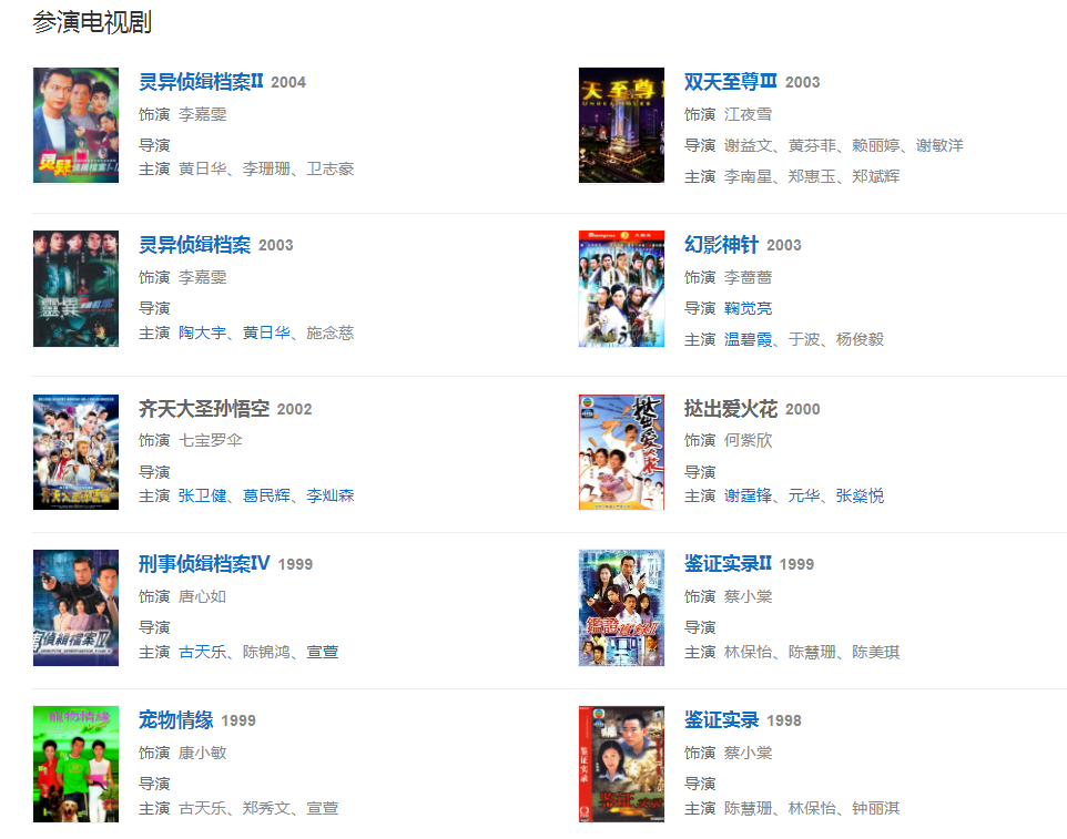 代表作品:鑒證實(shí)錄、刑事偵緝檔案IV、致命密函、江湖告急、五鼠斗御貓