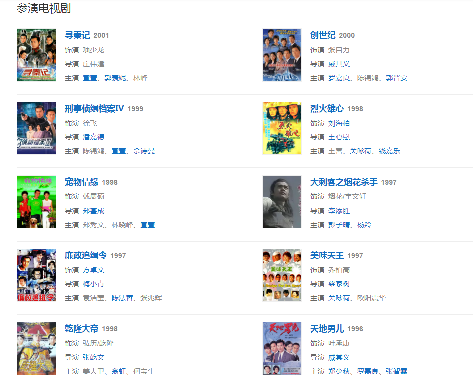 代表作品:神雕俠侶、尋秦記、保持通話、竊聽風云、一個好爸爸、寶貝計劃、毒戰(zhàn)、掃毒、殺破狼·貪狼、刑事偵緝檔案IV、犯罪現場