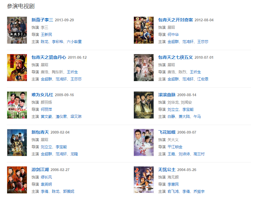 2006年與金超群、范鴻軒合作《新包青天》,再次飾演展昭,并相繼出演了《包青天之七俠五義》、《包青天之碧血丹心》、《包青天之開封奇案》。