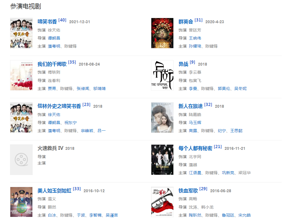 2016年3月29日,都市商戰(zhàn)題材電視劇《我們的千闕歌》在杭州開機,5月13日,與杜若溪合作主演民國懸疑探案劇《同謀者》在地面頻道首輪播出,10月20日,陳鍵鋒主演民國奇幻懸疑劇《異戰(zhàn)》,。