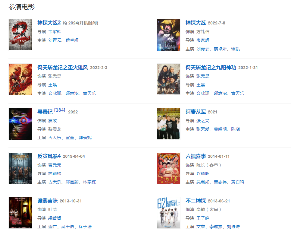 2019年主演犯罪動(dòng)作電影《反貪風(fēng)暴4》和警匪網(wǎng)劇《機(jī)動(dòng)部隊(duì)》。