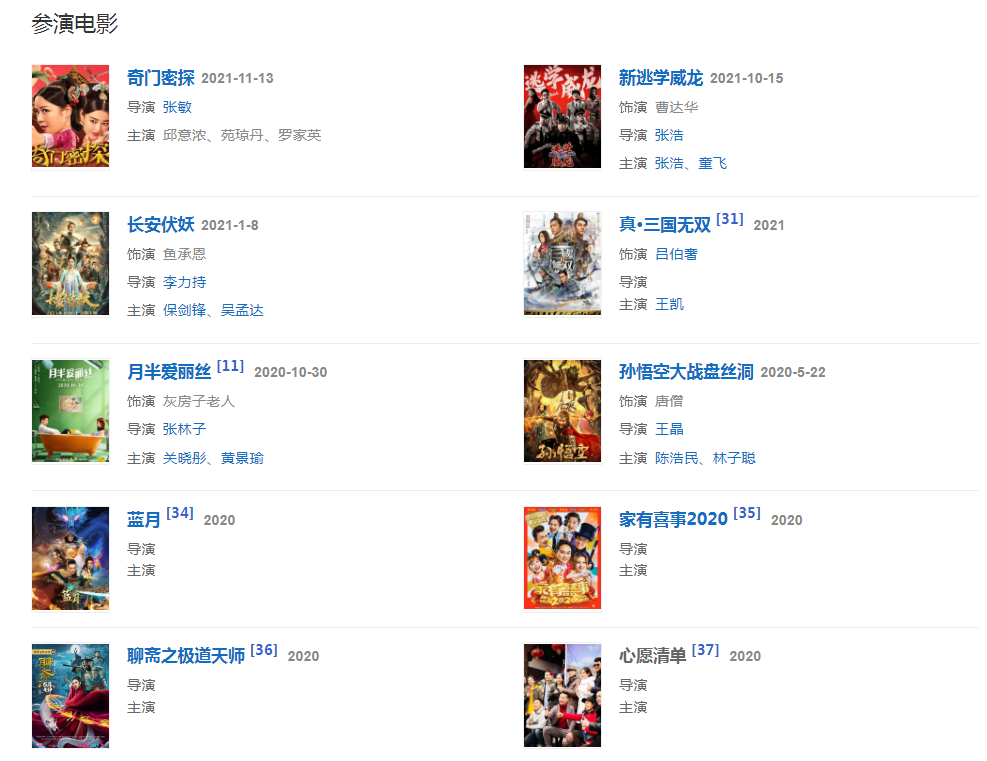 2021年1月8日,主演的大型動(dòng)作玄幻電影《長(zhǎng)安伏妖》上映 ;4月29日參與主演的電影《真·三國(guó)無雙》在中國(guó)香港上映、5月1日在中國(guó)大陸上映;11月13日,主演的古裝喜劇電影《奇門密探》在愛奇藝視頻全網(wǎng)獨(dú)播, 同年,參演懸疑探案網(wǎng)劇《女法醫(yī)JD》。