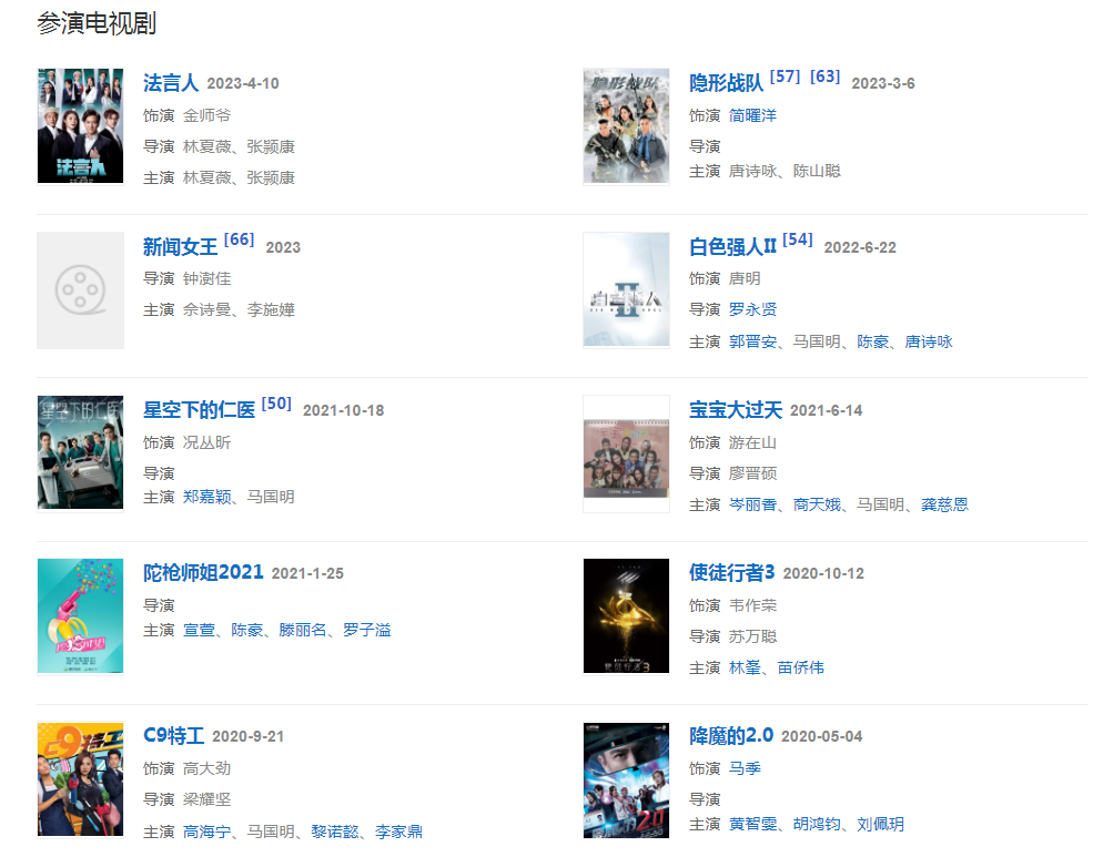 代表作品:降魔的、白色強(qiáng)人、On Call 36小時(shí)、飛虎之雷霆極戰(zhàn)、律政新人王Ⅱ