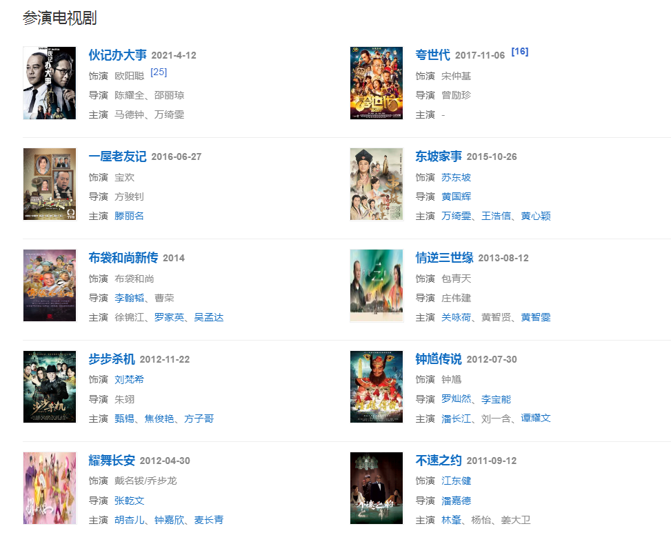 代表作品:法證先鋒、醉打金枝、壹號皇庭、陀槍師姐、洗冤錄、賭場風云