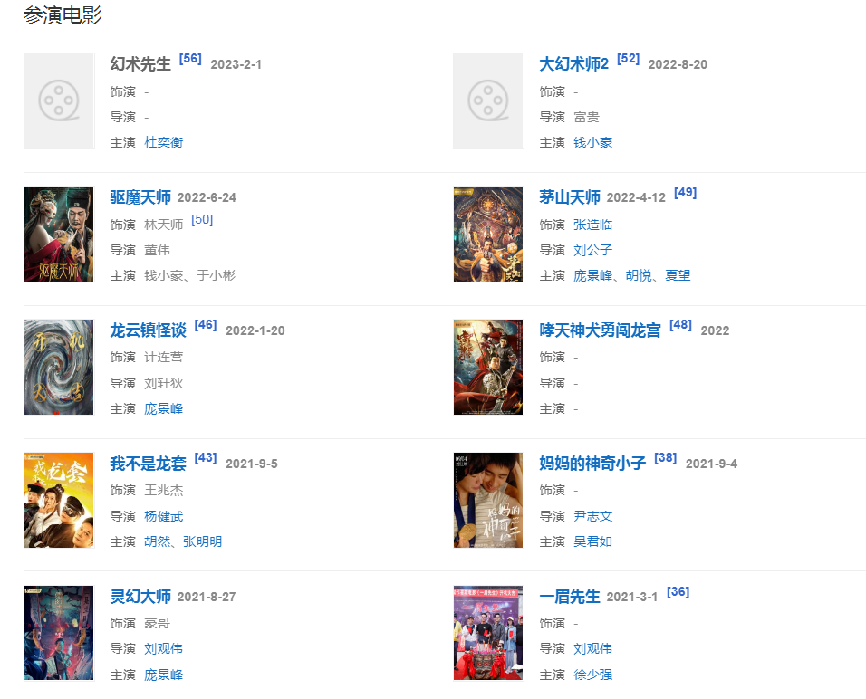 2022年4月12日,主演的電影《茅山天師》在愛奇藝上線播出,在片中飾演張?jiān)炫R。6月28日,主演的電影《驅(qū)魔天師》在優(yōu)酷、愛奇藝播出,在片中飾演林天師。