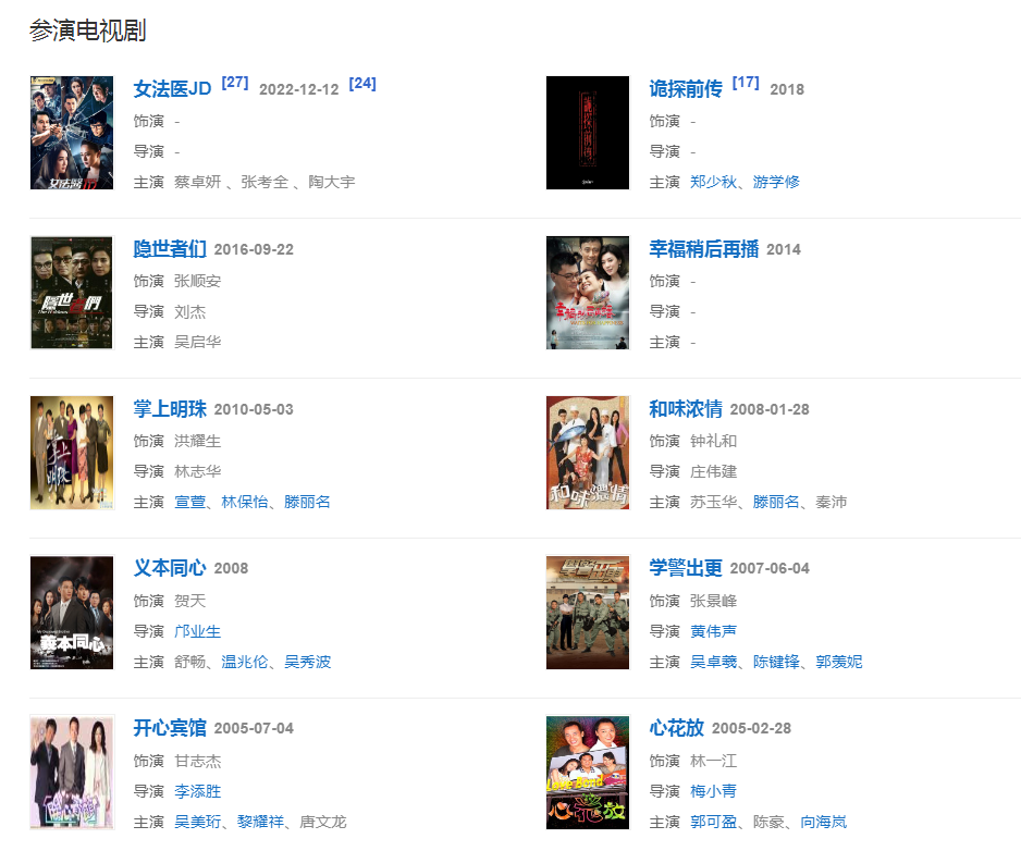 代表作品:刑事偵緝檔案、縱橫四海、壹號皇庭、掌上明珠、倚天屠龍記