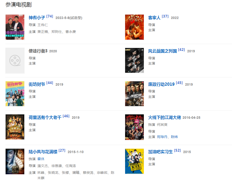 2019年12月11日,其出演的劇情式歷史紀錄片《風(fēng)云戰(zhàn)國之列國》開播;同年,主演劇集《荷里活有個大老千》和《街坊財爺》;同年,客串《廉政行動2019》。